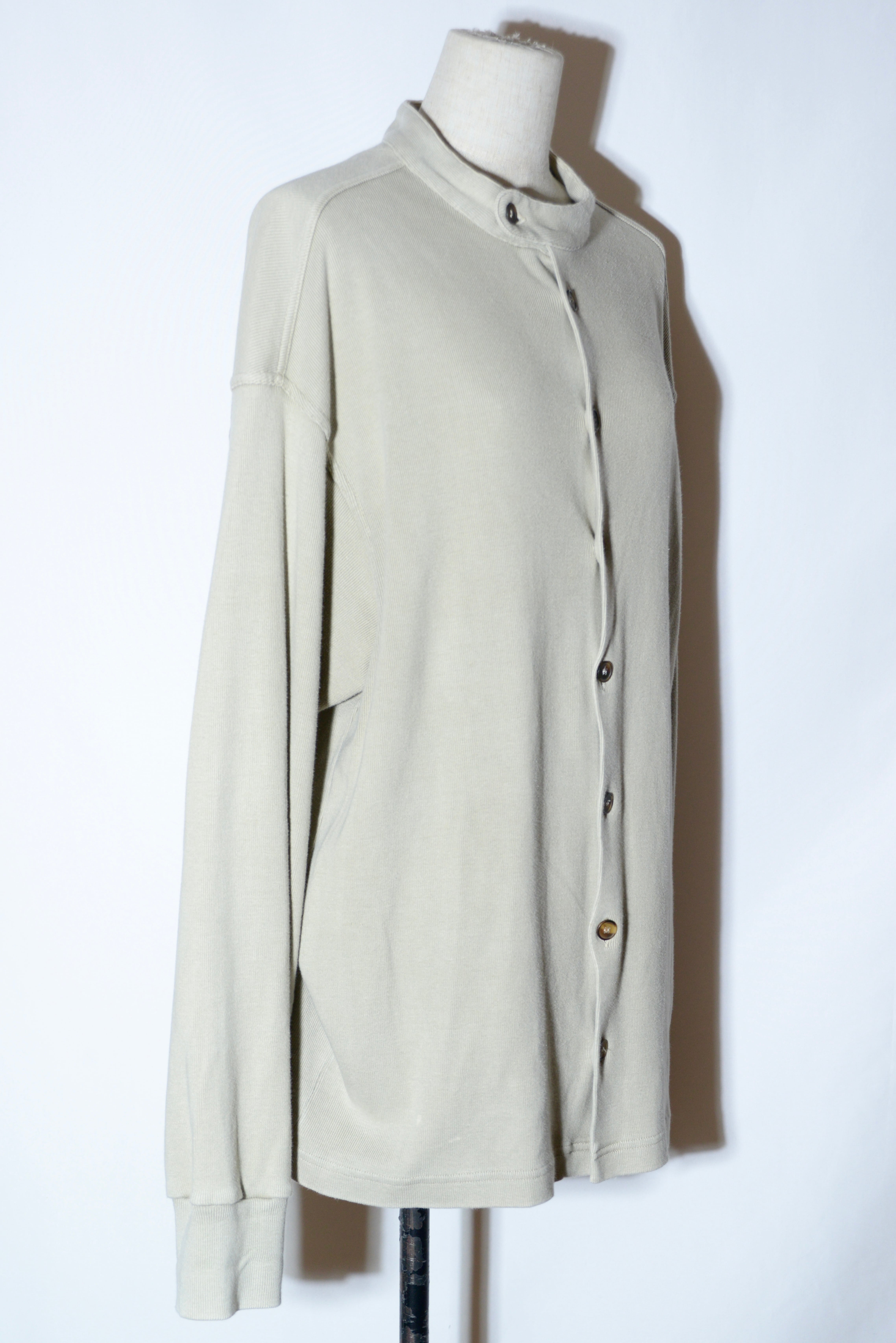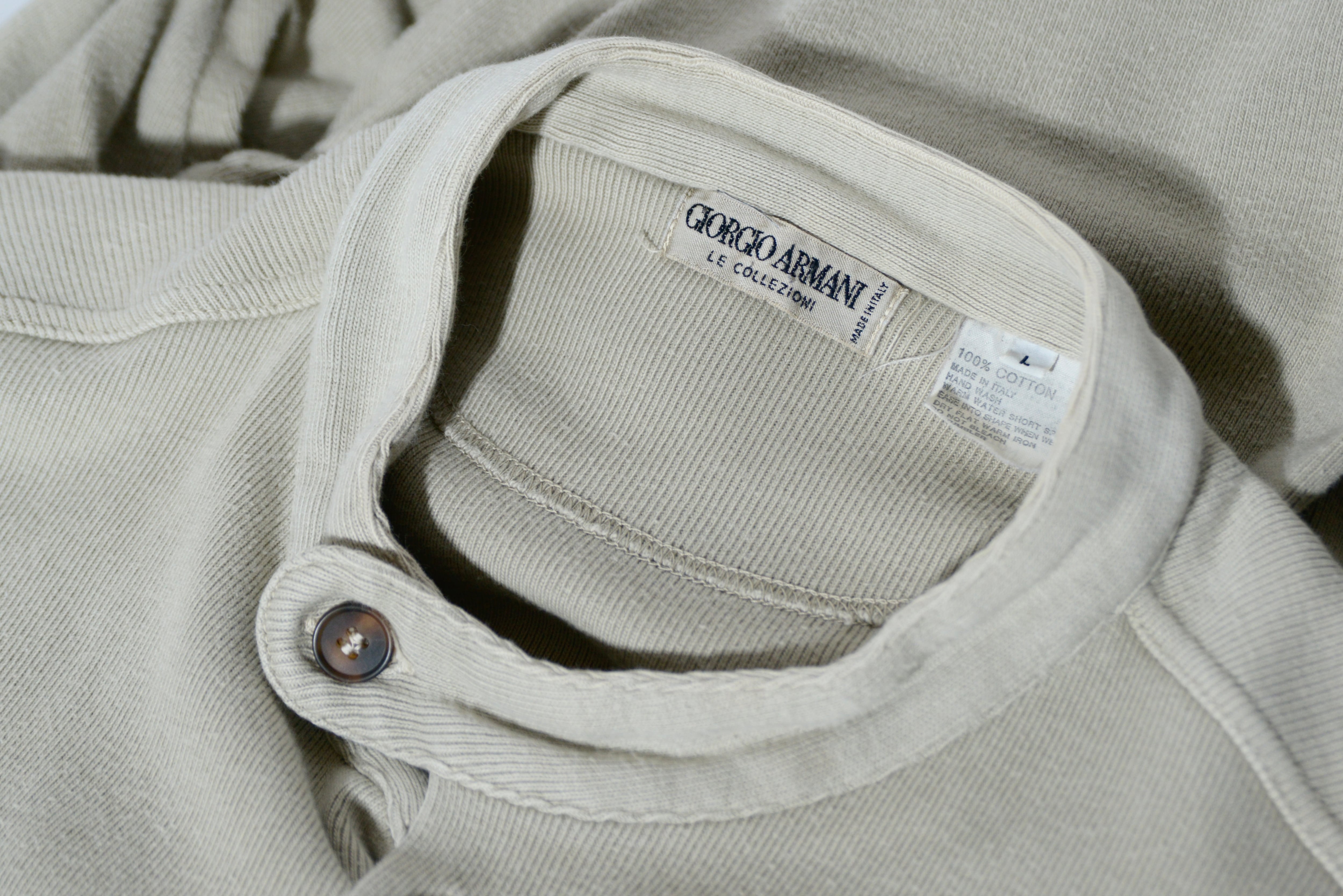 ヘンリーネックのサーマルなどを思わせるデザインで、デニムとの合わせやアルマーニらしいグレートーンのジャケットなどと合わせるのに適したアイテム。