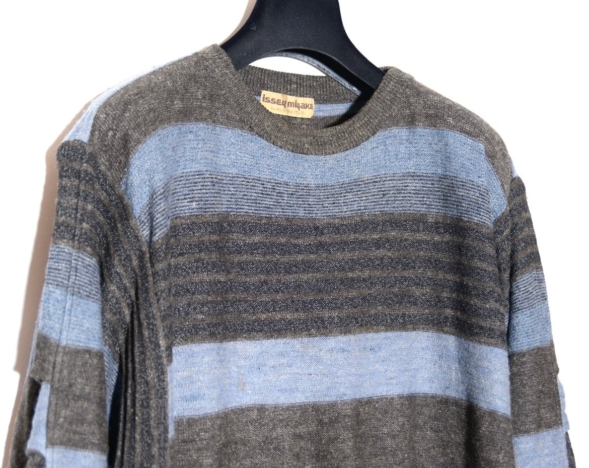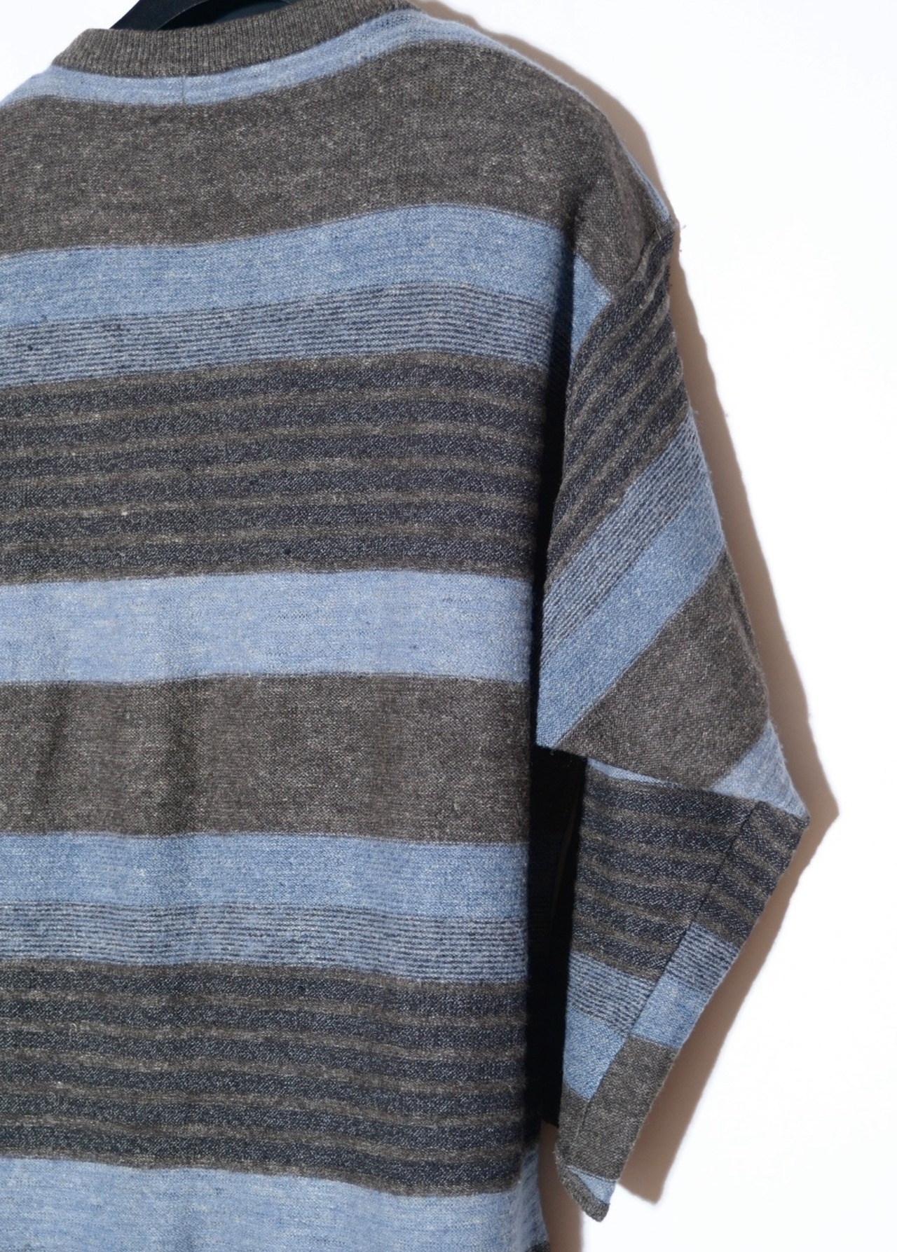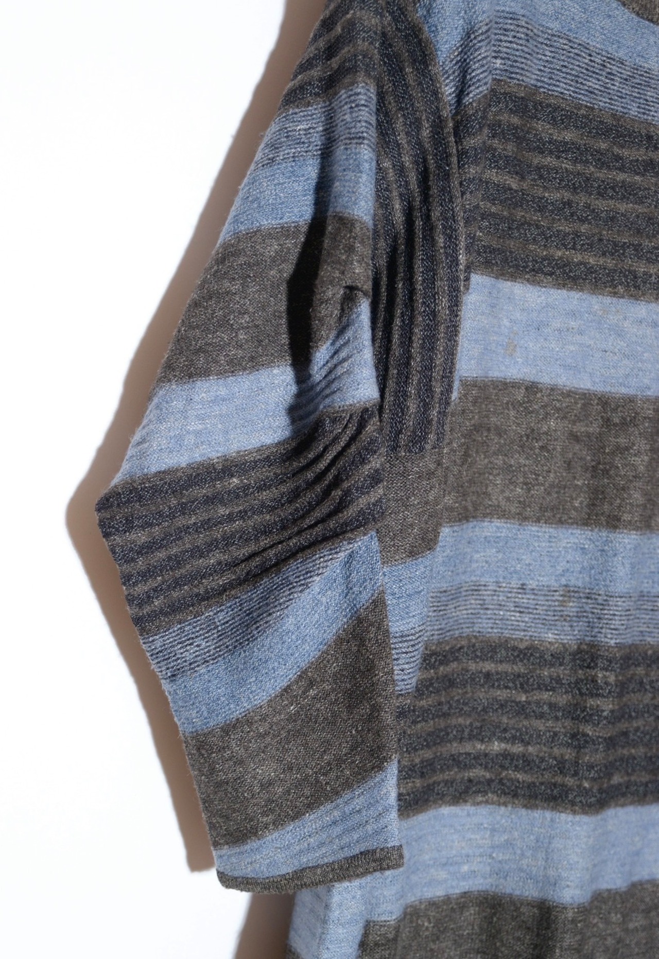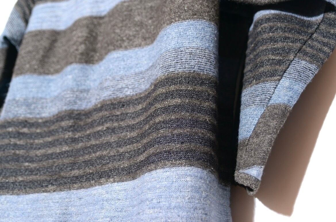 ボーダー柄の中に凹凸感のある立体的な編みを混ぜ込んだり、肘部分を摘んで形を作ったりと、シンプルなシルエットの中に細かなデザインが入っています。