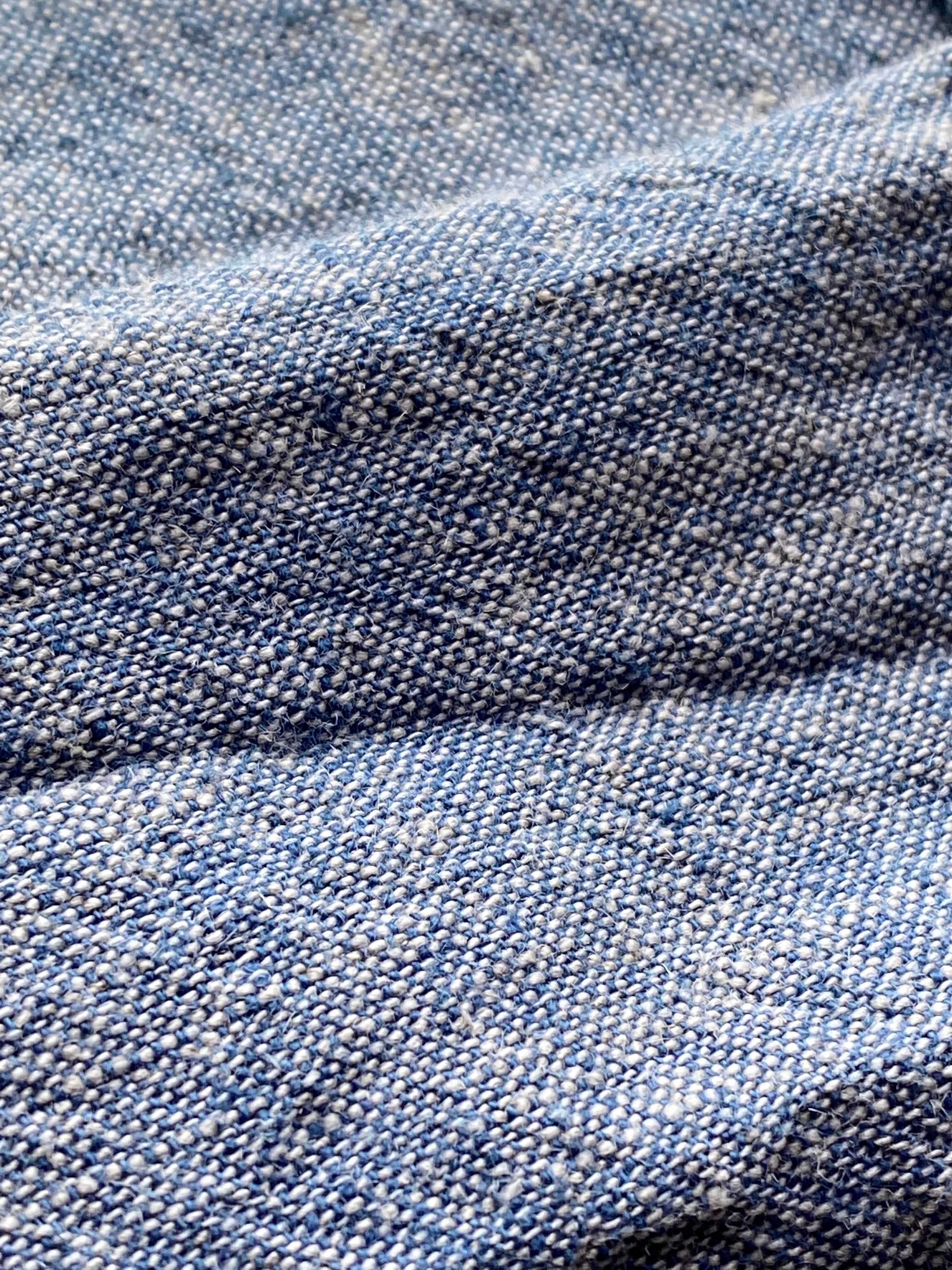 白と水色の太さにムラのある糸を使う事で、複雑な色味を出した手仕事感の強い生地を使っています。