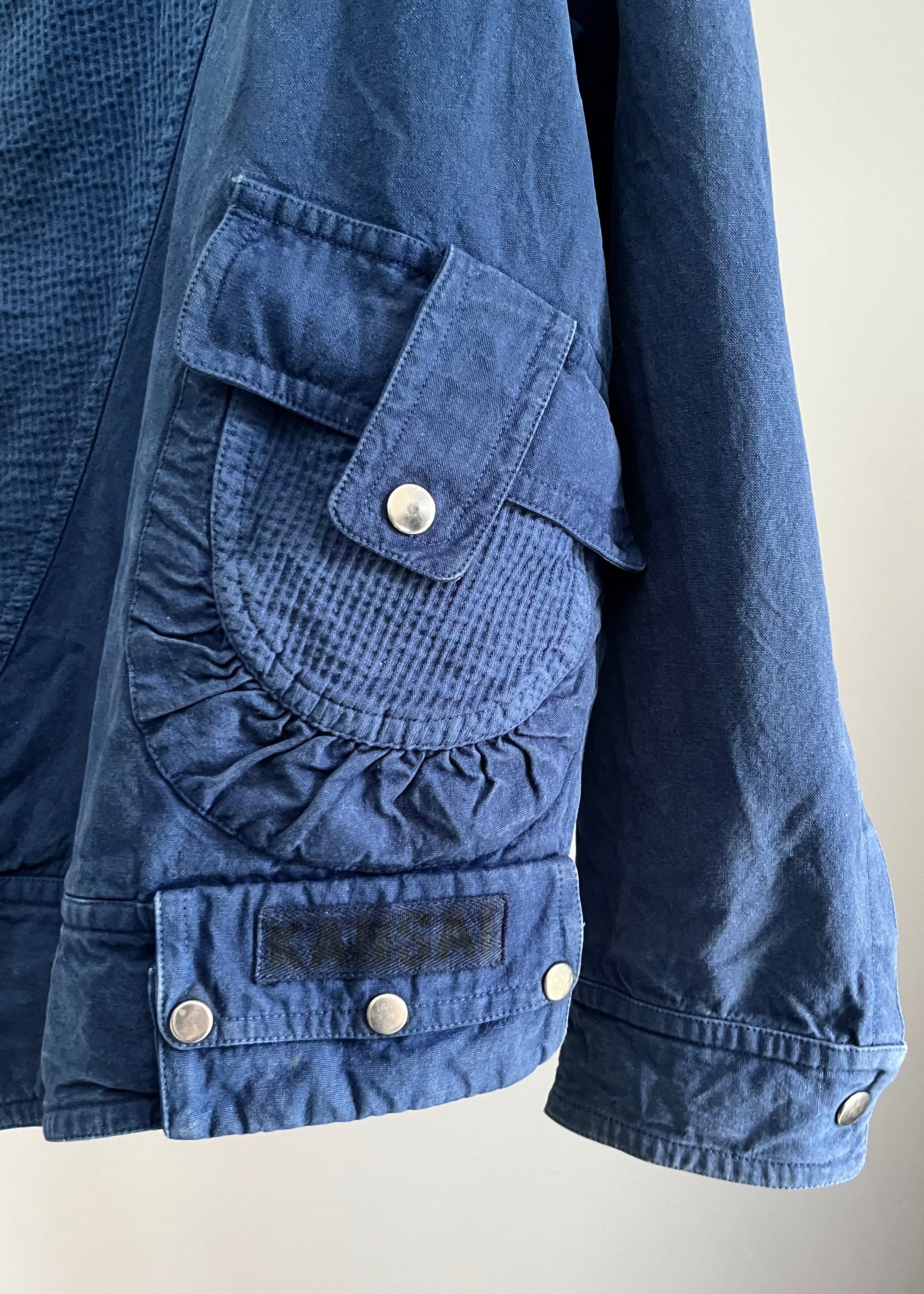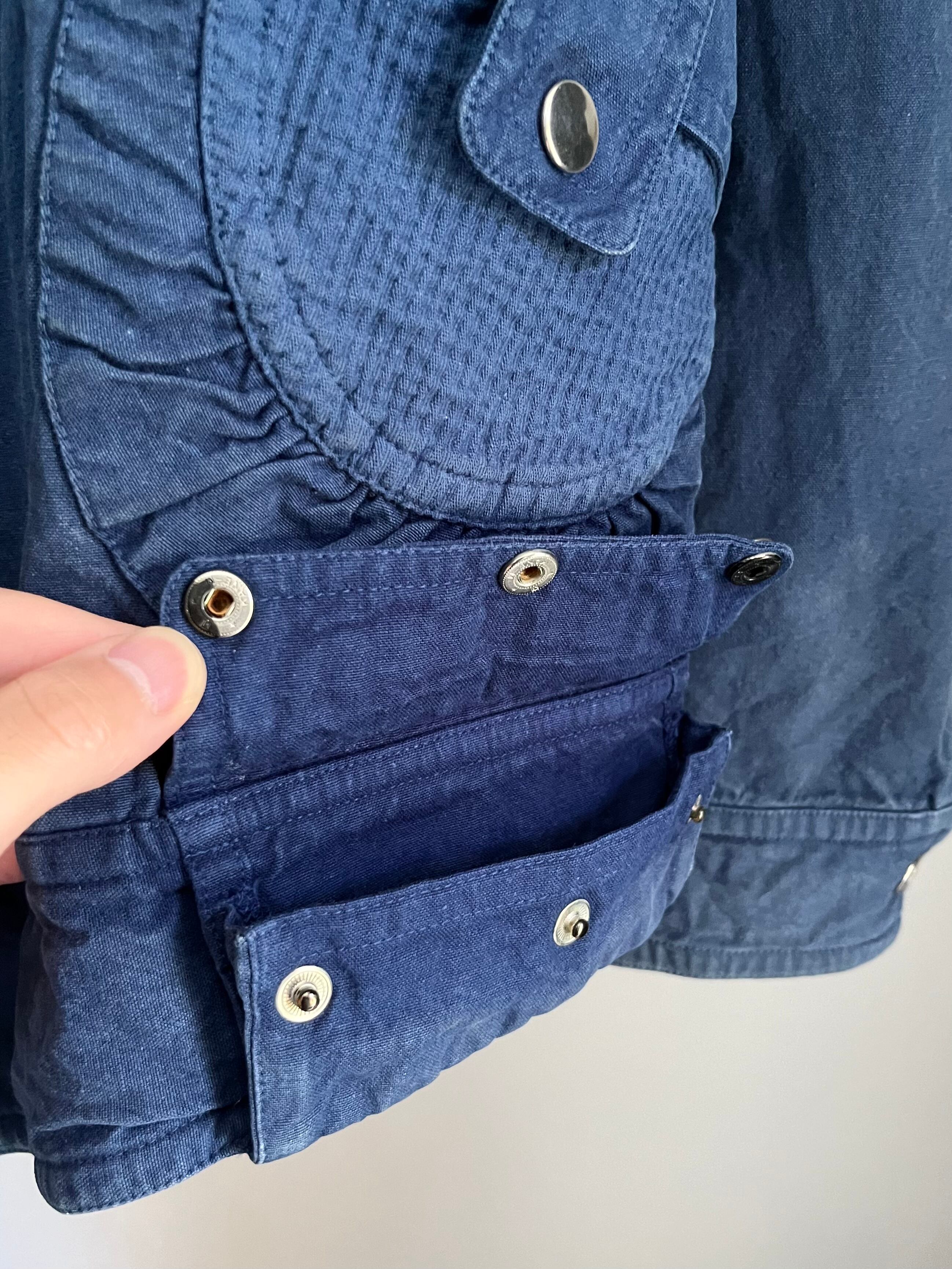 柔道着などにも使われる生地である刺し子織は耐久性が高いもので、それをパッチに使っています。円形のポケットやわざとはみ出るように作られた前合わせの端など、興味深いディテールが詰まっています。